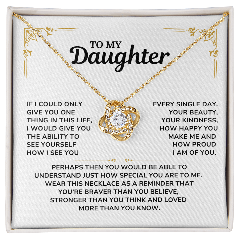 Your “To My Daughter” necklace comes carefully packaged in a complimentary soft-touch box, ready for gifting. For an unforgettable presentation, upgrade to our mahogany-style luxury box, complete with a glowing LED spotlight.